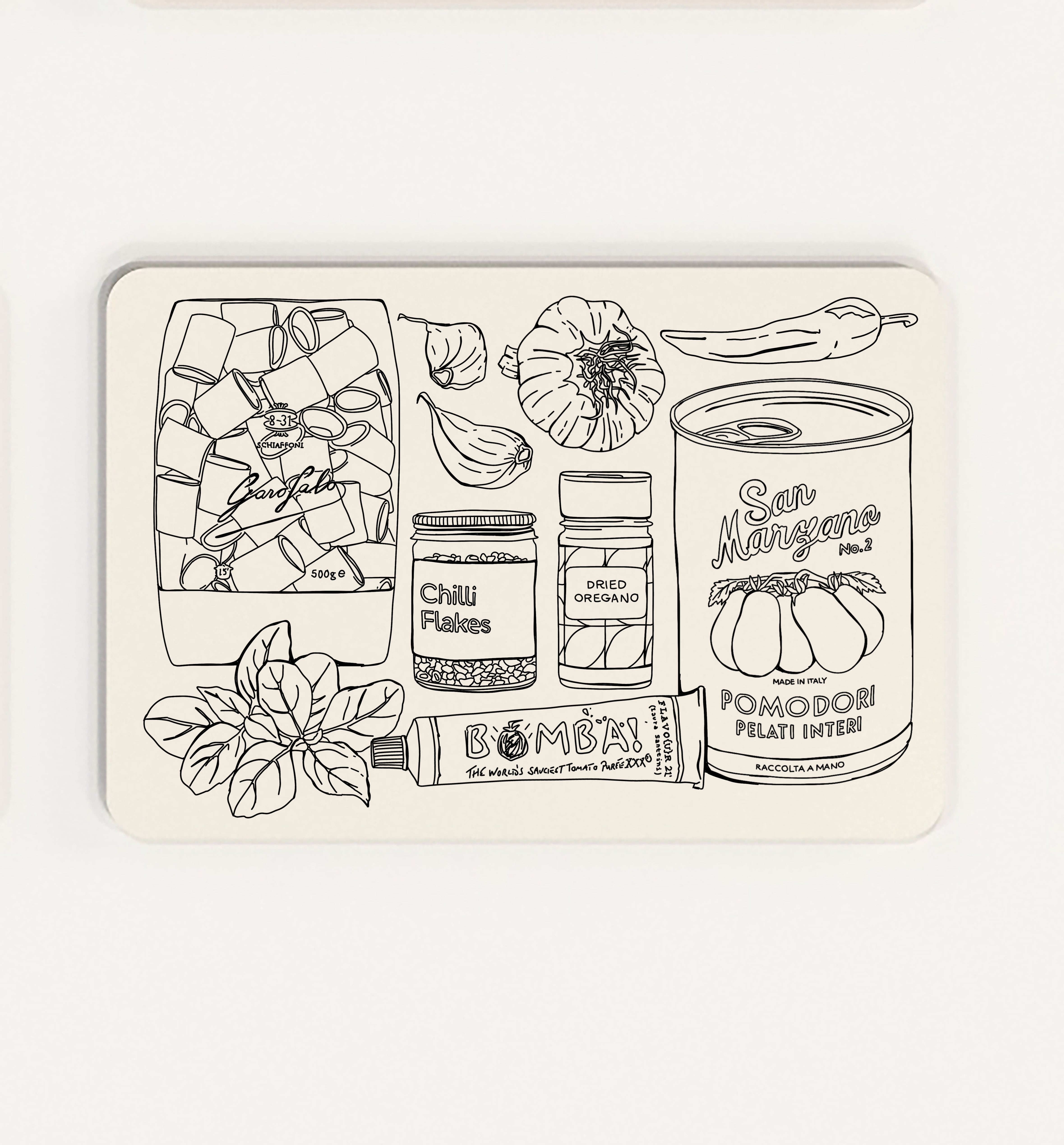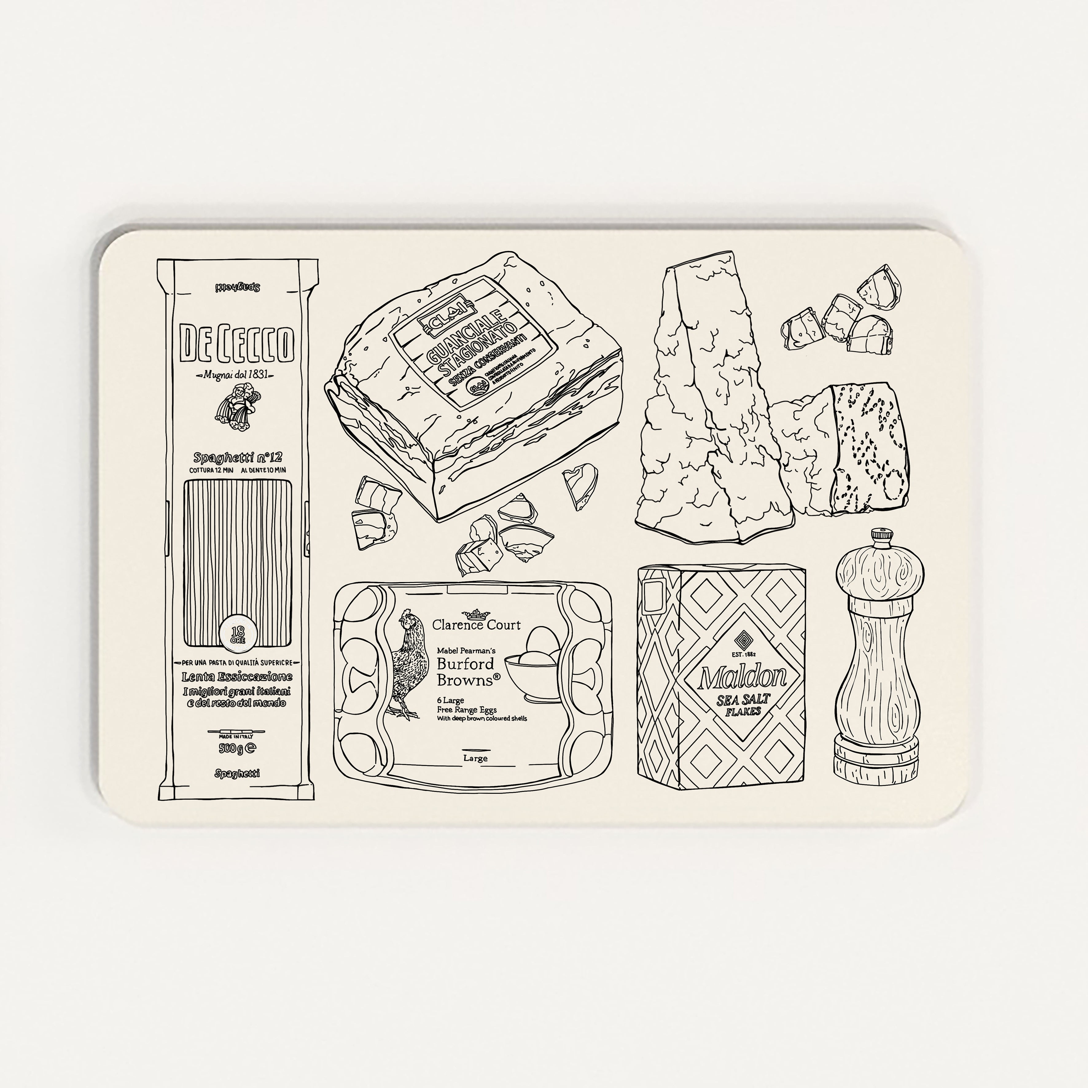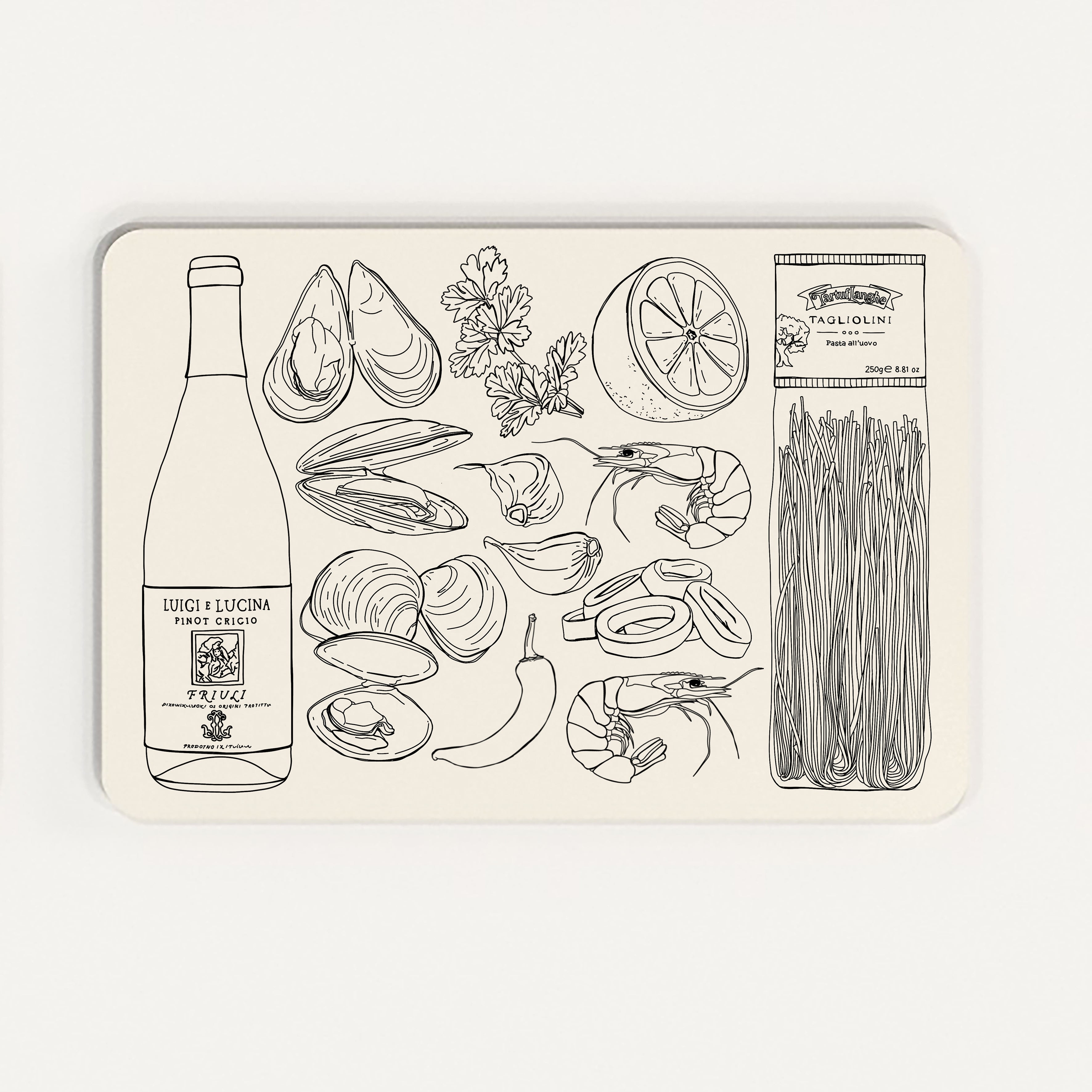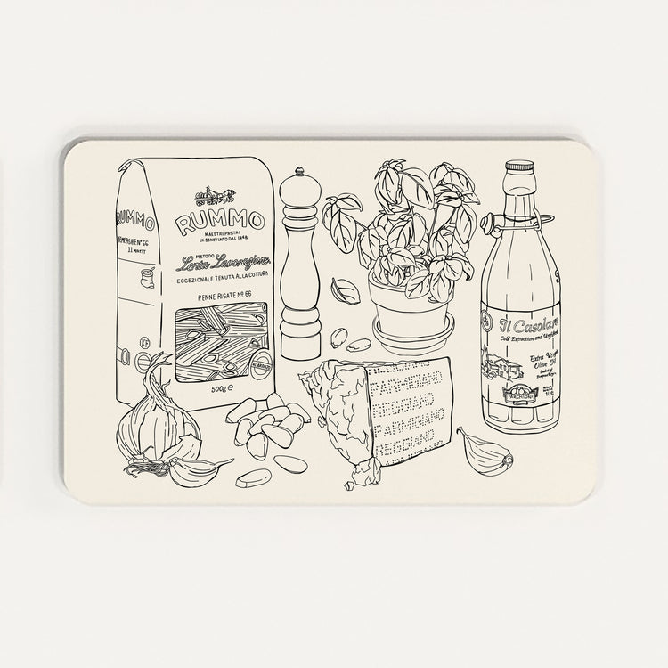 Six recipe placemats, Pesto pasta, Carbonara, Seafood Taglinioli, Arrabiata, Cacio E Pepe and Vodka Rigatoni