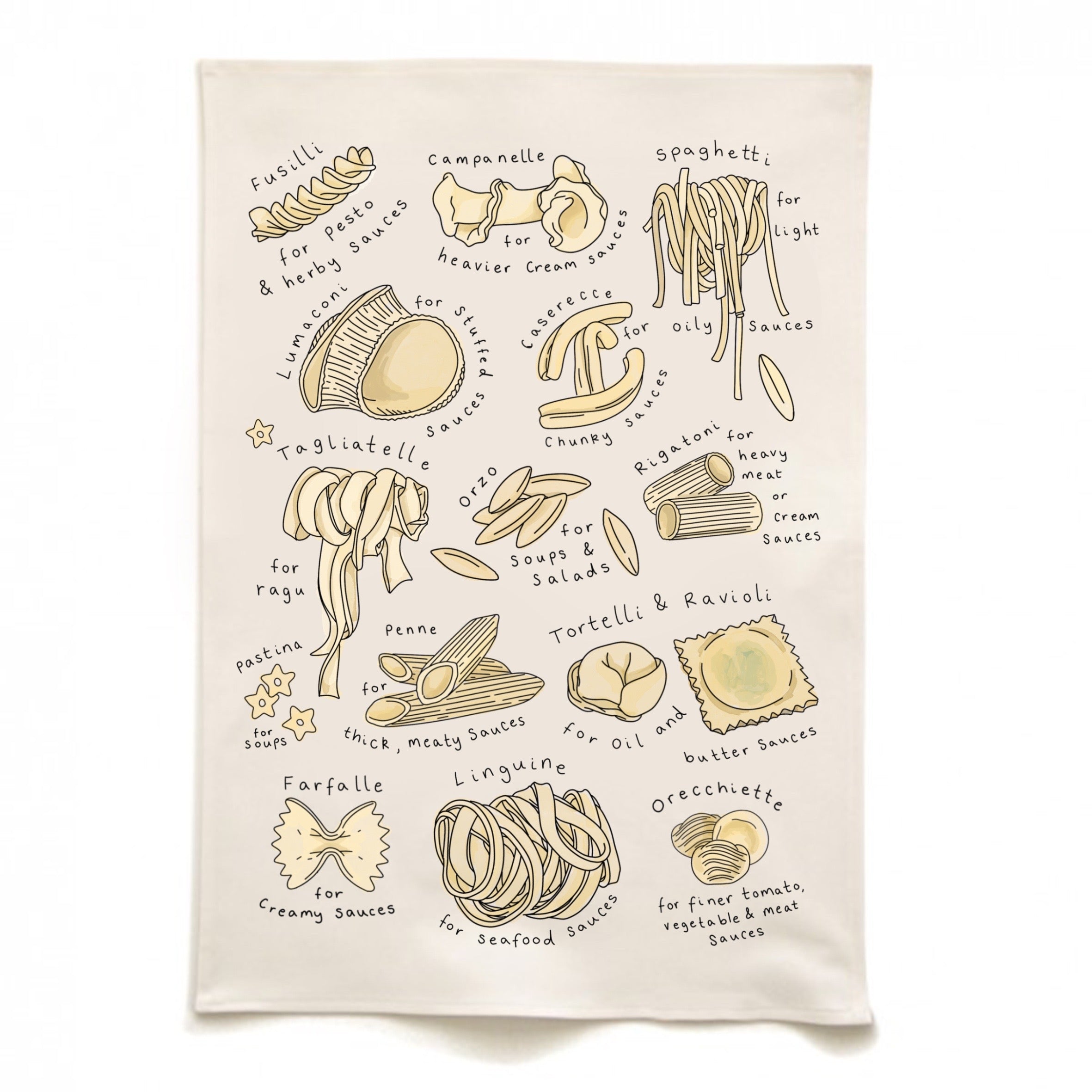 Organic Cotton Tea Towel with hand drawn illustrations of pasta shapes and their pairings :)